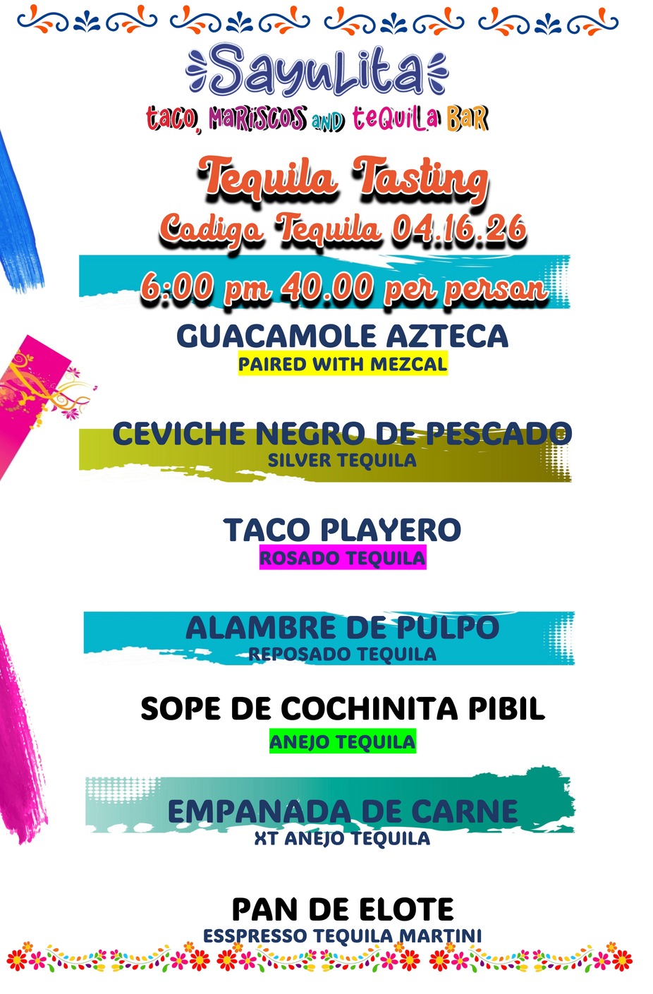 Codigo 1530 Tequila Tasting April 16th 2026 at 6 pm cost $40.00 per person included Mexican Appetizers